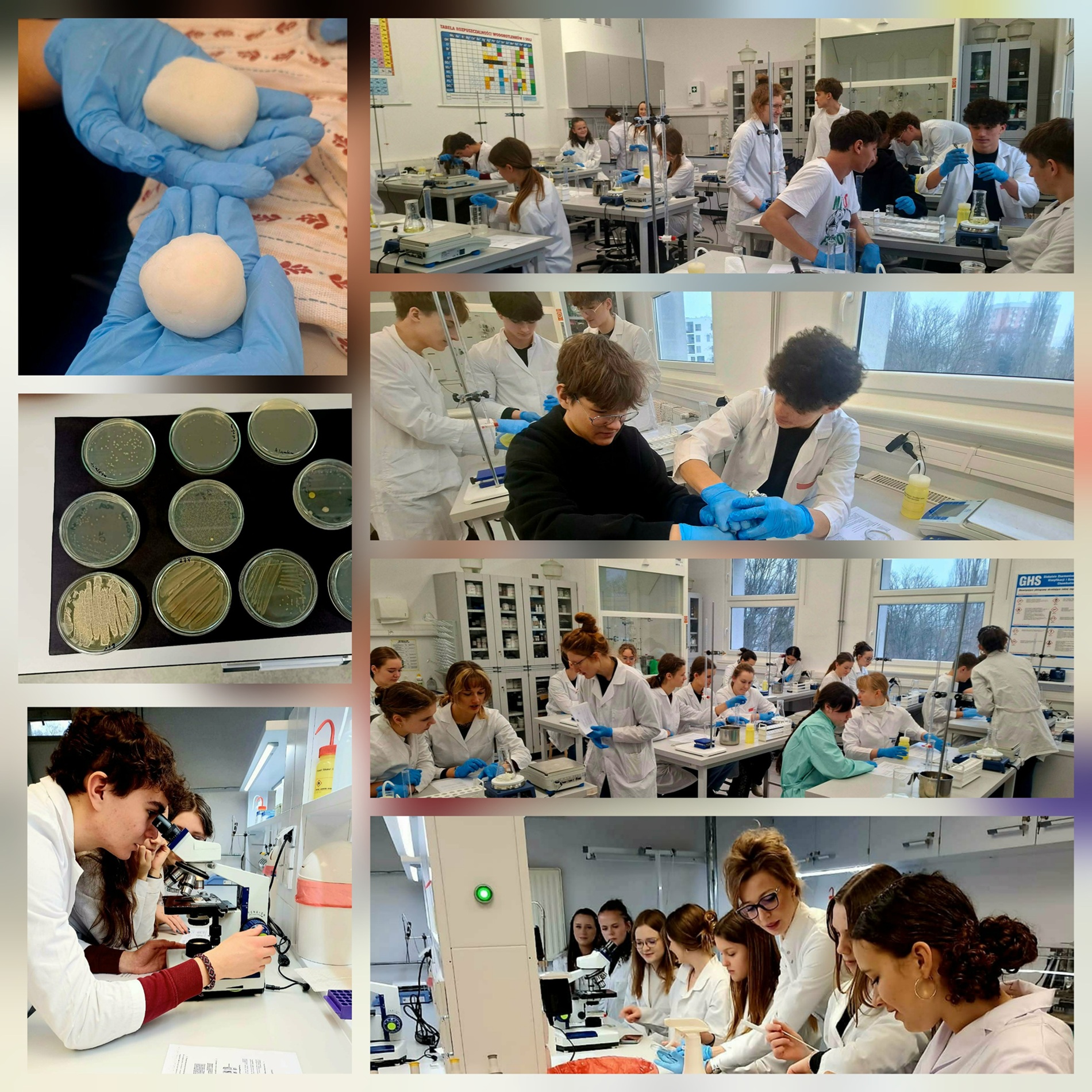 5 lutego 2026 uczniowie klasy 3e wzięli udział w warsztatach "Mydło i brud" prowadzonych przez dr hab. Beatę Łubkowską z AWFiS w Gdańsku. Program wykładu i warsztatów obejmował część teoretyczną dotyczącą rodzajów brudu, budowę mydła oraz reakcję saponifikacji. W części laboratoryjnej uczniowie zbierali mikroorganizmy ze skóry metodą wymazu, dokonywali posiewu próbek oraz barwienia metodą Grama, a następnie otrzymywali mydło kosmetyczne o określonym zapachu.