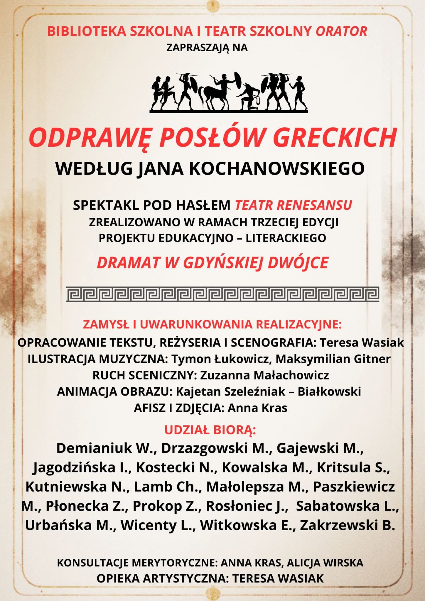 Spektakl został poprzedzony informacjami o genezie "Odprawy posłów greckich"Jana Kochanowskiego i jej przesłaniu.
